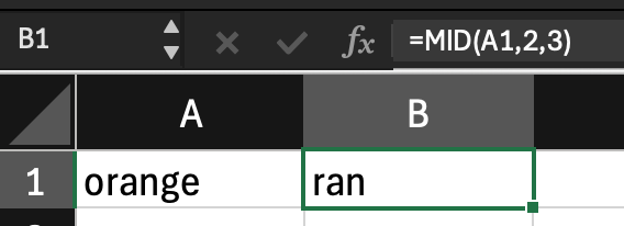 MID retrieves characters from the middle of a text string, starting at a specified position. For instance, if cell A1 contains the word “orange”, =MID(A1, 2, 3) returns “ran”.