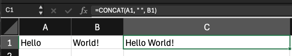 Finally, CONCAT merges multiple text strings together. if A1 contains the word “Hello” and A2 contains the word “World!”, =CONCAT(A1, " ", B2) produces the output “Hello World!”.