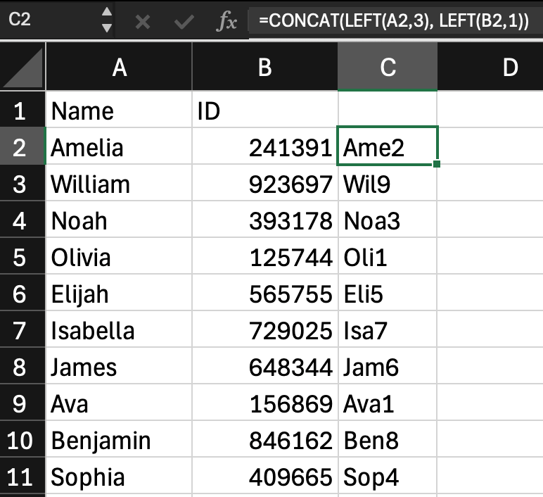 Imagine you have a list of employee names (column A) and their IDs (column B). Your goal is to create a new column (C) containing unique codes: the first digit of the ID plus the first three letters of the name. The formula =CONCAT(LEFT(A2, 3), LEFT(B2, 1)) does exactly that. Simply drag it down column C to auto-generate codes for every employee.