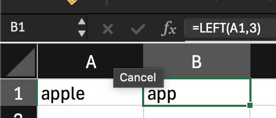 LEFT pulls a specified number of characters from the beginning of a text string. For example, if cell A1 contains the word “apple”, =LEFT(A1, 3) returns “app”.