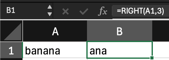 RIGHT extracts a specified number of characters from the end of a text string. For example, if cell A1 contains the word “banana”, =RIGHT(A1, 3) returns “ana”.